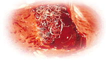 白く細長いそうめん状の虫体(フィラリア成虫)が肺動脈や右心室に寄生し、右心不全をはじめとして肝臓、腎臓、肺などに障害を起こします。