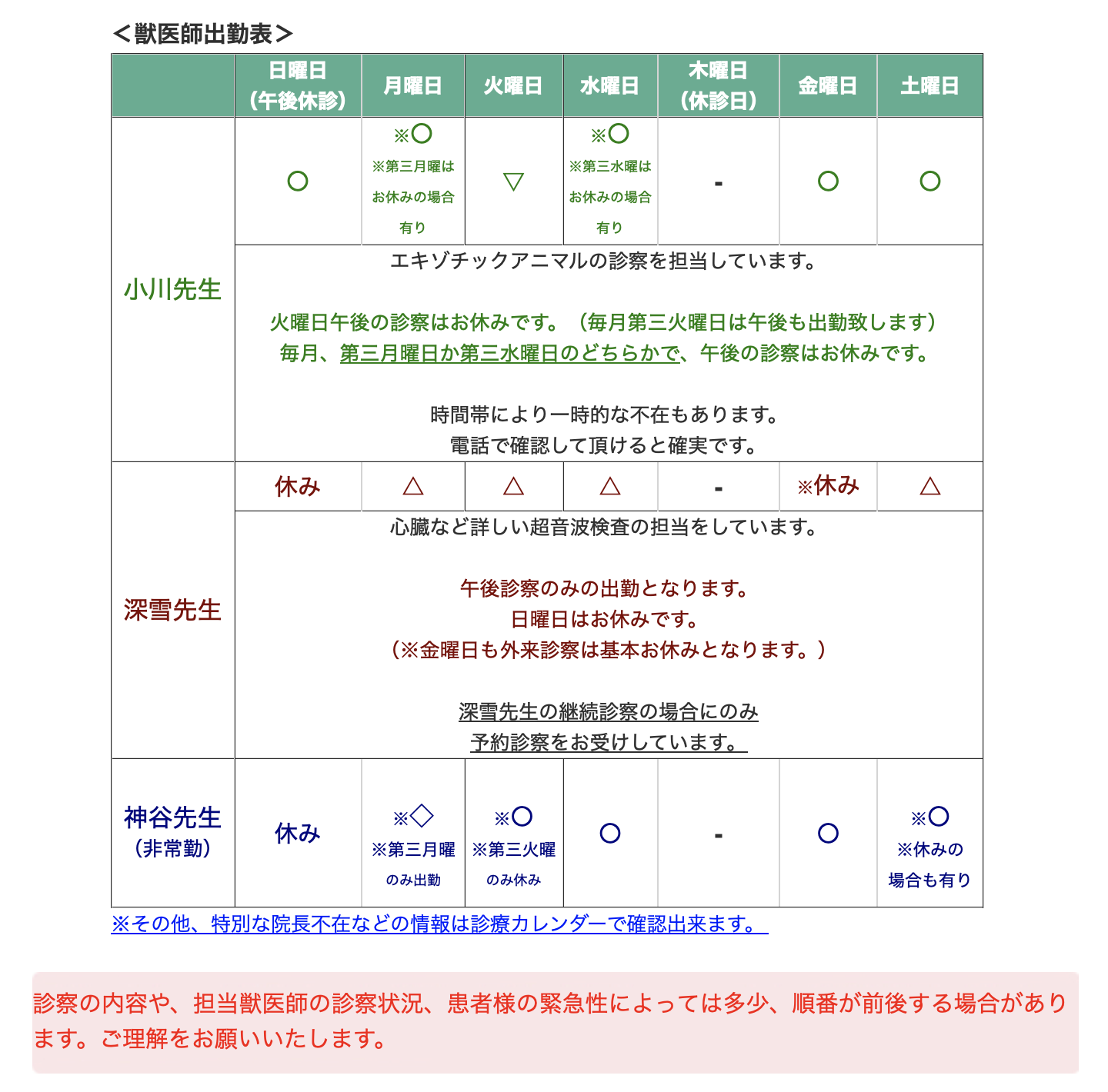 - お知らせ【獣医師出勤表※2023.11/12最新版】
