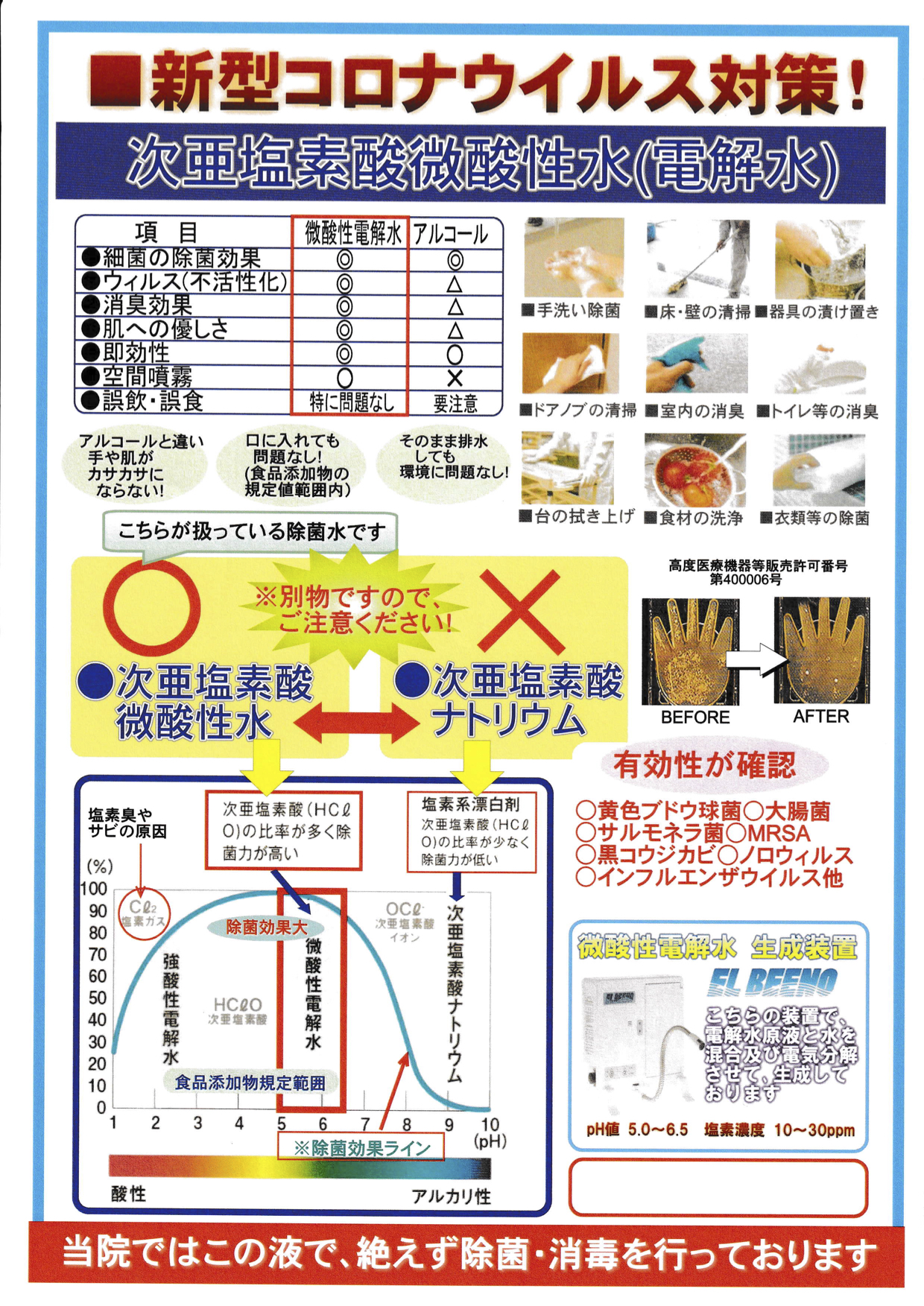 当院で使用している微酸性次亜塩素酸水エルビーノはノロウイルスやインフルエンザ にも効果のあり、歯科医院でも使用され、うがいに使用しても安全な除菌水です。