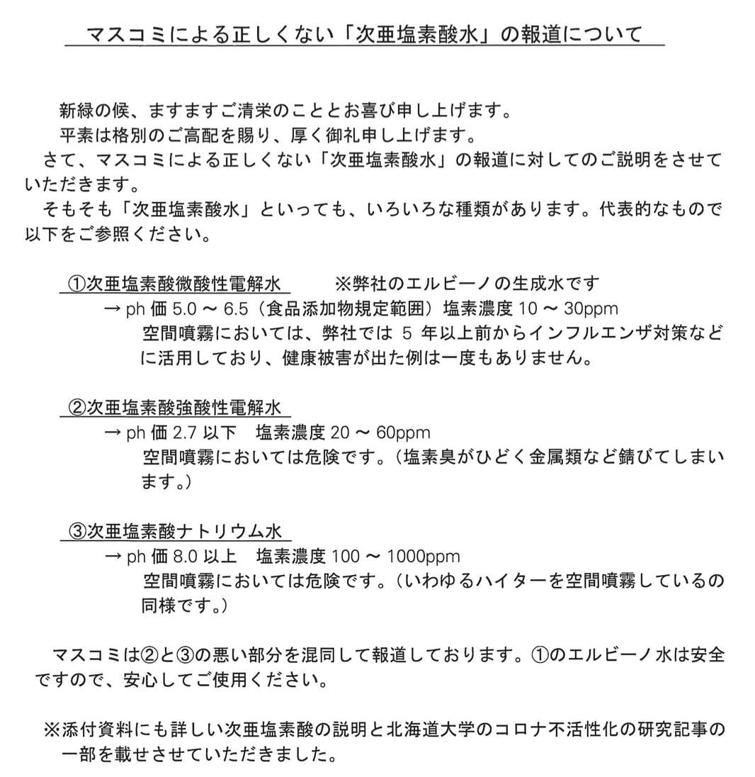 【除菌水(微酸性次亜塩素酸水エルビーノ)のご案内】